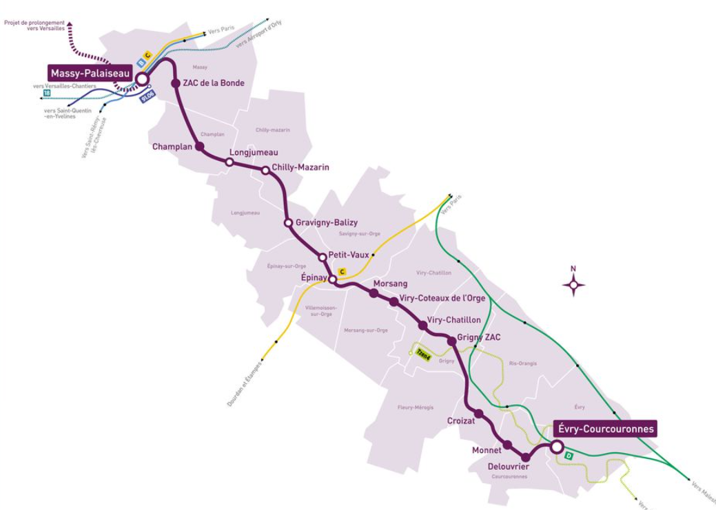 Between Massy and Épinay-sur-Orge, the tram-train will replace the current RER C route on this portion. From Épinay-sur-Orge to Évry, it will switch to tram mode. 16 stations are served, including 8 in the urban area which has obtained the creation of 2 new stations, in Champlan and Massy-Europe.